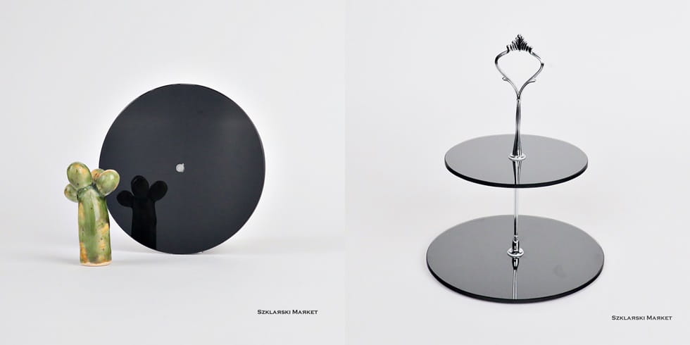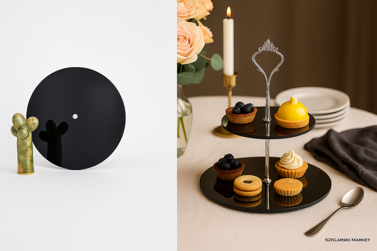 zastosowanie: szkło czarne do pater szklanych, szkło do pater dwu i trzy poziomowych oraz pojedynczych etażerek, do serwowania wypieków, owoców, przekąsek i słodyczy, dekoracja stołu, ozdoba stołu